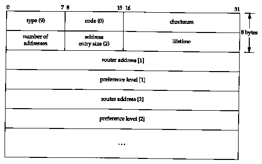 RFC 1256 [Deering 1991] specifies the format of these two ICMP messages. Figure 9.6 shows the format of the ICMP router solicitation message. Figure 9.7 shows the format of the ICMP router advertisement message sent by routers.