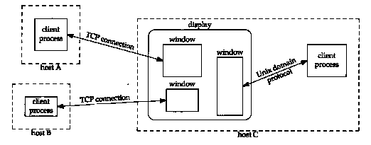 This design, where a single server handles multiple clients, differs from the normal TCP concurrent server design that we described in Section 18.11. The FTP and Telnet servers, for example, spawn a new process each time a new TCP connection request arrives, so each client communicates with a different server process. With X, however, all clients, running on the same host or on a different host, communicate with a single server.