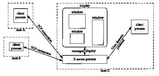 Figure 30.1 shows one possible scenario with three clients using one display. One client is on the same host as the server, using the Unix domain protocols. The other two clients are on different hosts, using TCP. One client is normally a window manager that has authority for the layout of windows on the display. The window manager allows us to move windows around the screen, or change their size, for example.