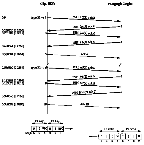 The same exchange occurs when the next special function key is typed (segments 6-10). As we expect, the time difference between segments 5 and 10 (slip sending the acknowledgment of the echo) is a multiple of 200 ms, since both ACKs are delayed.