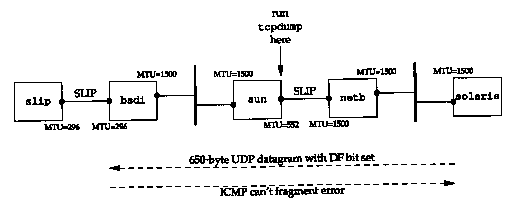 We then examined the ICMP unreachable error that is part of the new path MTU discovery feature (Section 2.9). We watched path MTU discovery using Traceroute and UDP We also looked at the interaction between UDP and ARP whereby most ARP implementations only retain the most recently transmitted datagram to a given destination, while waiting for an ARP reply.