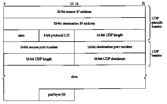 In this figure we explicitly show a datagram with an odd length, requiring a pad byte for the checksum computation. Notice that the length of the UDP datagram appears twice in the checksum computation.