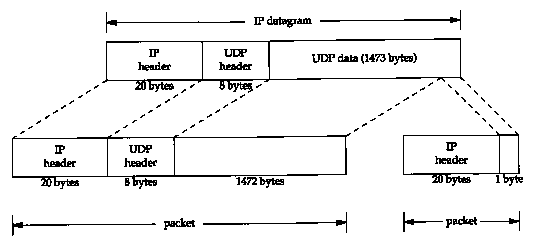 Using UDP it is easy to generate IP fragmentation. (We'll see later that TCP tries to avoid fragmentation and that it is nearly impossible for an application to force TCP to send segments large enough to require fragmentation.) We can use our sock program and increase the size of the datagram until fragmentation occurs. On an Ethernet the maximum amount of data in a frame is 1500 bytes (Figure 2.1), which leaves 1472 bytes for our data, assuming 20 bytes for the IP header and 8 bytes for the UDP header. We'll run our sock program, with data sizes of 1471, 1472, 1473, and 1474 bytes. We expect the last two to cause fragmentation: